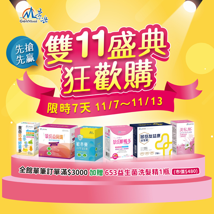 活動期間(11/7-11/13)全館單筆訂單滿$3000,加贈653益生菌洗髮精1瓶(市價$480)(不累計)