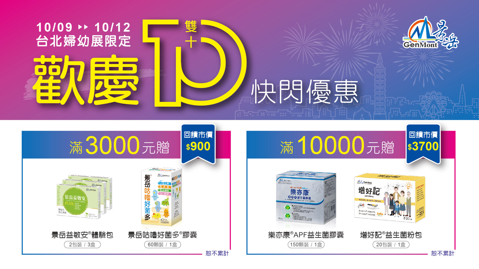 單筆消費滿$10000,加贈【輔助調整過敏體質】樂亦康益生菌膠囊150顆1盒、【幫助思緒清晰】增好記益生菌粉包20包1盒(回饋市價$3700)(恕不累計)。